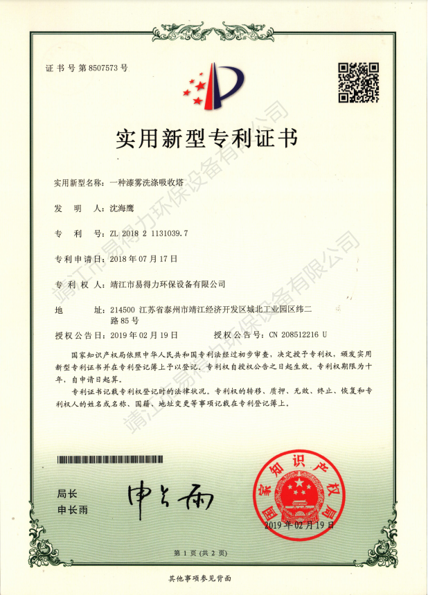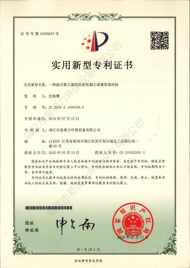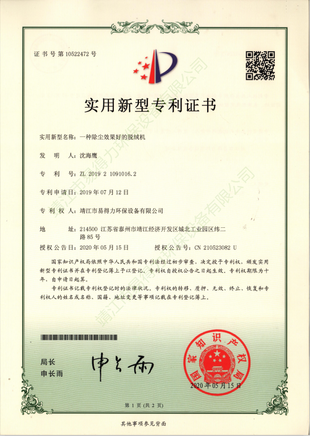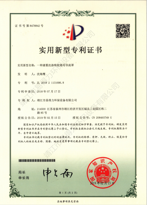 專利證書本公司坐落于開放開發(fā)超前城市江蘇靖江,我們精良優(yōu)秀設(shè)計團(tuán)隊始終遵循著創(chuàng)新超越的理念,贏得了中外合資企業(yè)的信賴。易得力環(huán)保設(shè)備有限公司與上海環(huán)科院等科研單位保持合作關(guān)系,不斷加大自身的科研力量,集中了一批國內(nèi)環(huán)境科技研究和應(yīng)用方面的高素質(zhì)人才,取得多項實(shí)用新型專利證書。…… 查看更多 >>